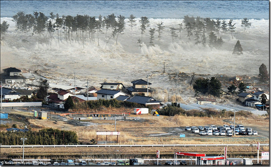 Raging seas: The tsunami pours through trees and engulfs homes on the coast of Natori, Miyagi Prefecture, after the earthquake struck.